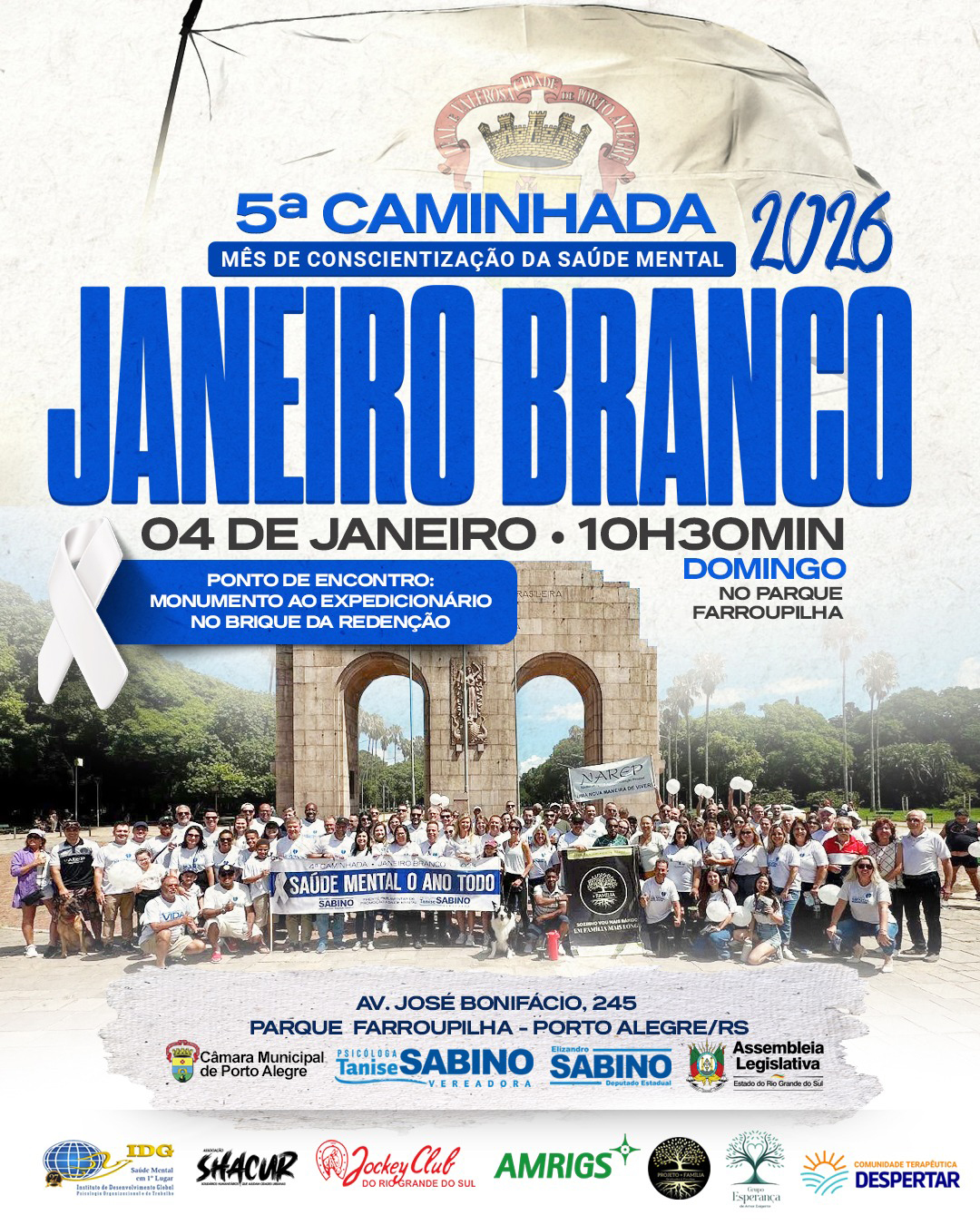 A 5ª edição da Caminhada do Janeiro Branco já tem data marcada: será no dia 4 de janeiro de 2026, primeiro domingo do ano, com concentração às 10h30min e saída às 11h no Parque Farroupilha (Brique da Redenção), em Porto Alegre. A mobilização, promovida pela Frente Parlamentar da Promoção à Saúde Mental da Câmara de Vereadores, com apoio dos Gabinetes da Vereadora Psicóloga Tanise Sabino e do Deputado Estadual Sabino, segue fortalecendo o movimento de conscientização sobre a importância do cuidado com a saúde mental.