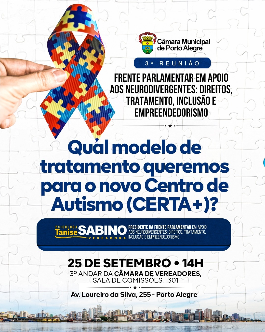 No dia 25 de setembro, às 14h, acontece a 3ª reunião da Frente Parlamentar em Apoio aos Neurodivergentes: Direitos, Tratamento, Inclusão e Empreendedorismo, presidida pela vereadora psicóloga Tanise Sabino, na Sala de Comissões (301), 3º andar da Câmara Municipal de Porto Alegre.