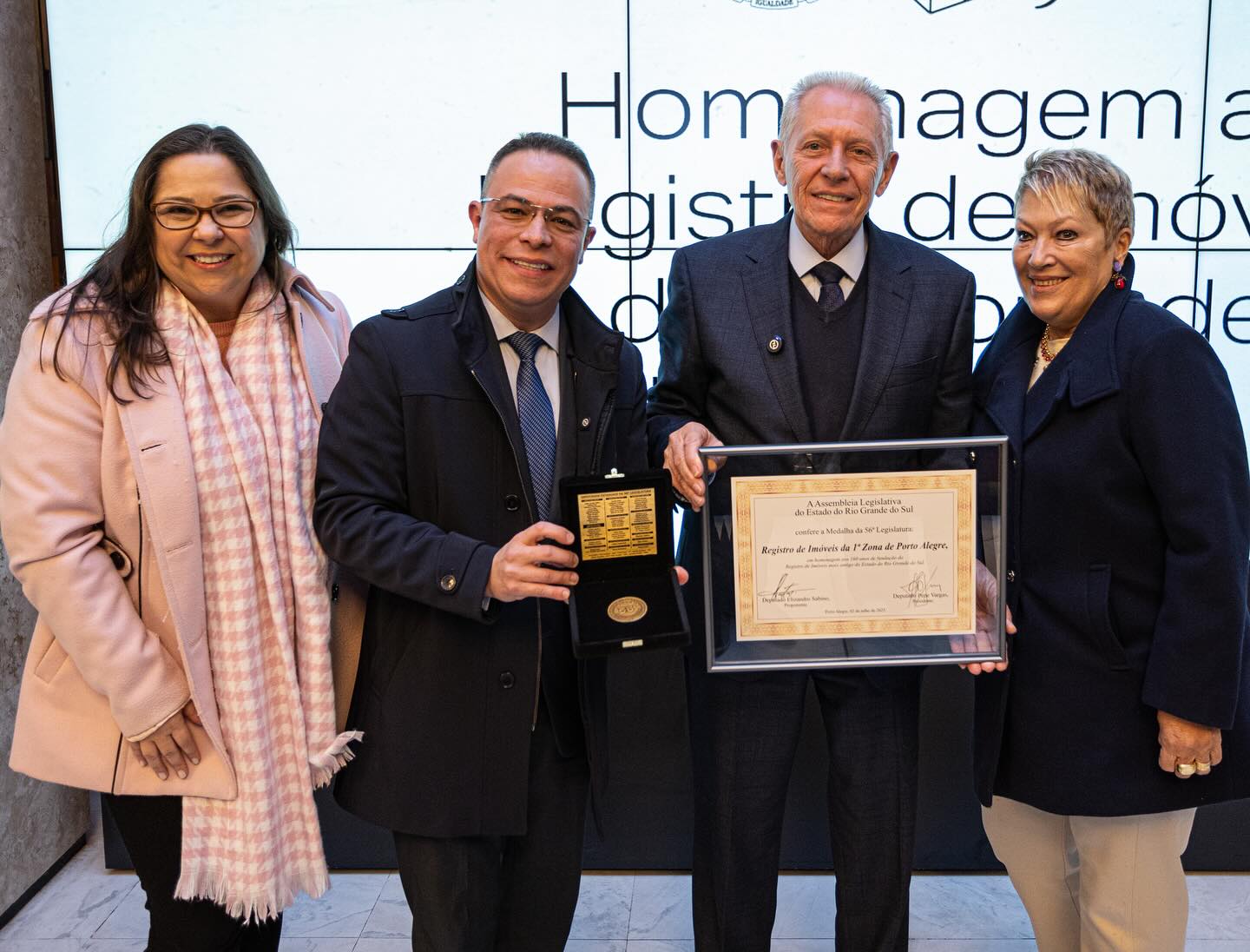 “Esta medalha representa o reconhecimento do Parlamento gaúcho à história de uma instituição que contribui de forma silenciosa, mas essencial, para a segurança jurídica, o desenvolvimento urbano e a proteção dos direitos de milhares de cidadãos. O 1º Registro de Imóveis de Porto Alegre é um patrimônio institucional do nosso Estado, e sua trajetória se confunde com a história da própria cidade”, afirmou o deputado Sabino, presidente da Frente Parlamentar da Justiça Notarial e Registral na Assembleia.