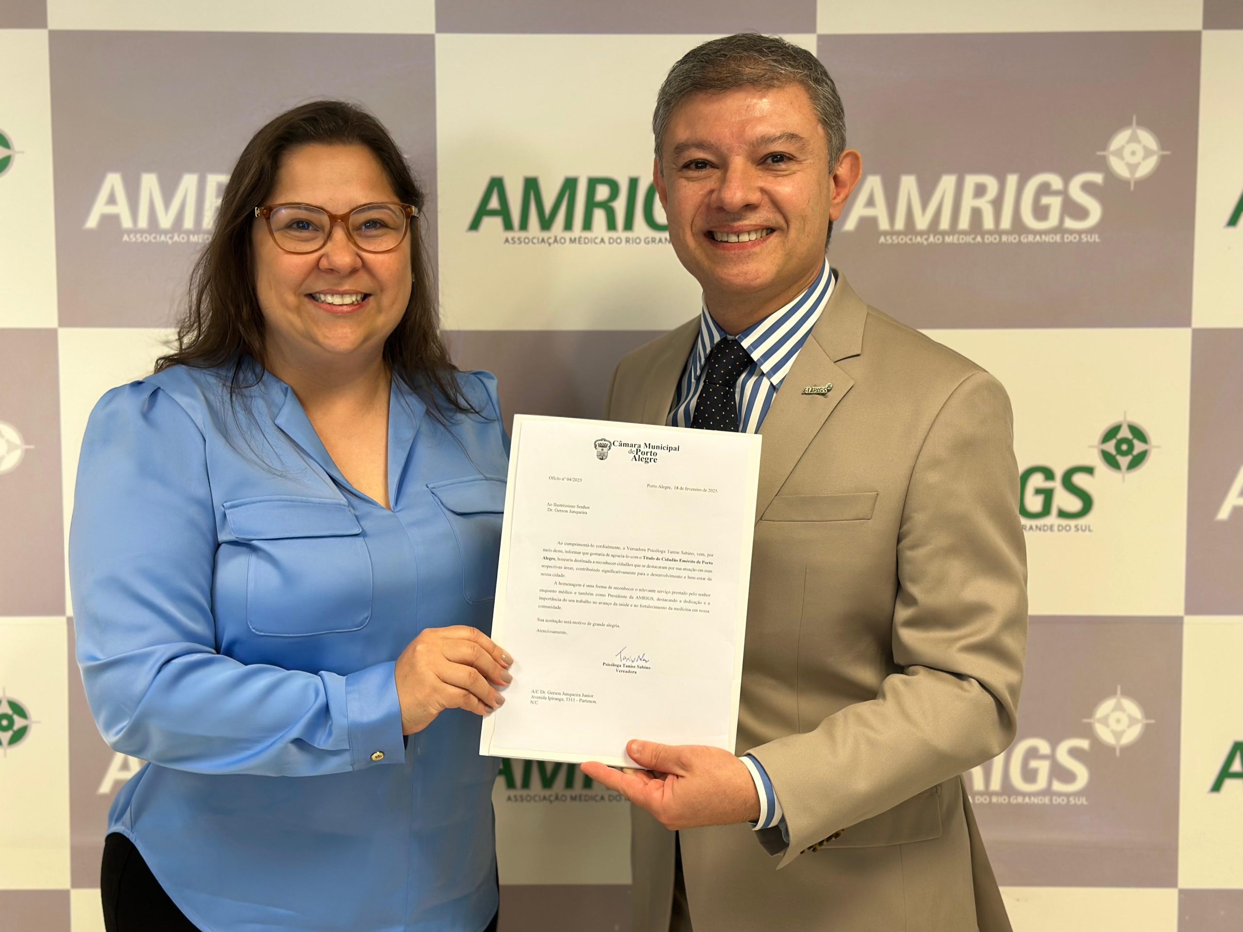 Na tarde do dia 18 de fevereiro, a Vereadora Psicóloga Tanise Sabino convidou o Dr. Gerson Junqueira Junior, presidente da Associação Médica do Rio Grande do Sul (AMRIGS), para receber o título de Cidadão Emérito de Porto Alegre, em reconhecimento à sua trajetória profissional e à sua dedicação à saúde e ao fortalecimento da classe médica no estado.