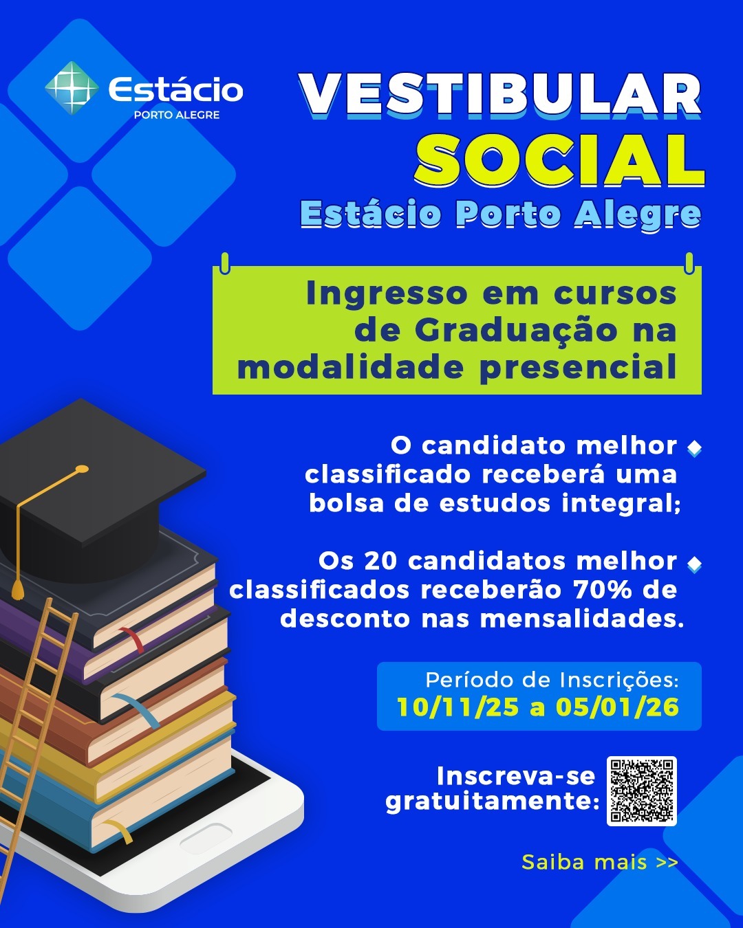A vereadora psicóloga Tanise Sabino divulgou nesta semana uma oportunidade voltada à formação acadêmica de jovens e adultos de Porto Alegre e região. A Estácio Porto Alegre, está com o processo seletivo aberto do Vestibular Social 2026/01, que oferece bolsa integral ao candidato melhor classificado, além de descontos de 70% nas mensalidades para os 20 primeiros colocados.