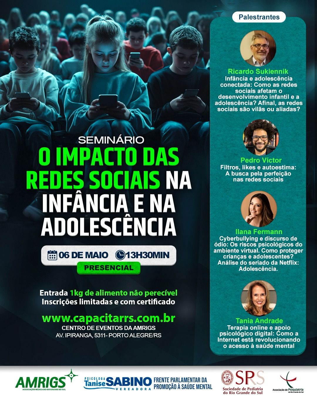 A Frente Parlamentar da Saúde Mental, presidida pela vereadora e psicóloga Tanise Sabino, promove, em parceria com a Associação Médica do Rio Grande do Sul (AMRIGS), a Associação de Psiquiatria do Rio Grande do Sul(APRS) e a Sociedade de Pediatria do Rio Grande do Sul (SPRS) o seminário “O impacto das mídias sociais na saúde mental na infância e adolescência”, no dia 6 de maio de 2025, terça-feira, das 13h30 às 18h30, na sede da AMRIGS (Av. Ipiranga, 5311 – Partenon, Porto Alegre).