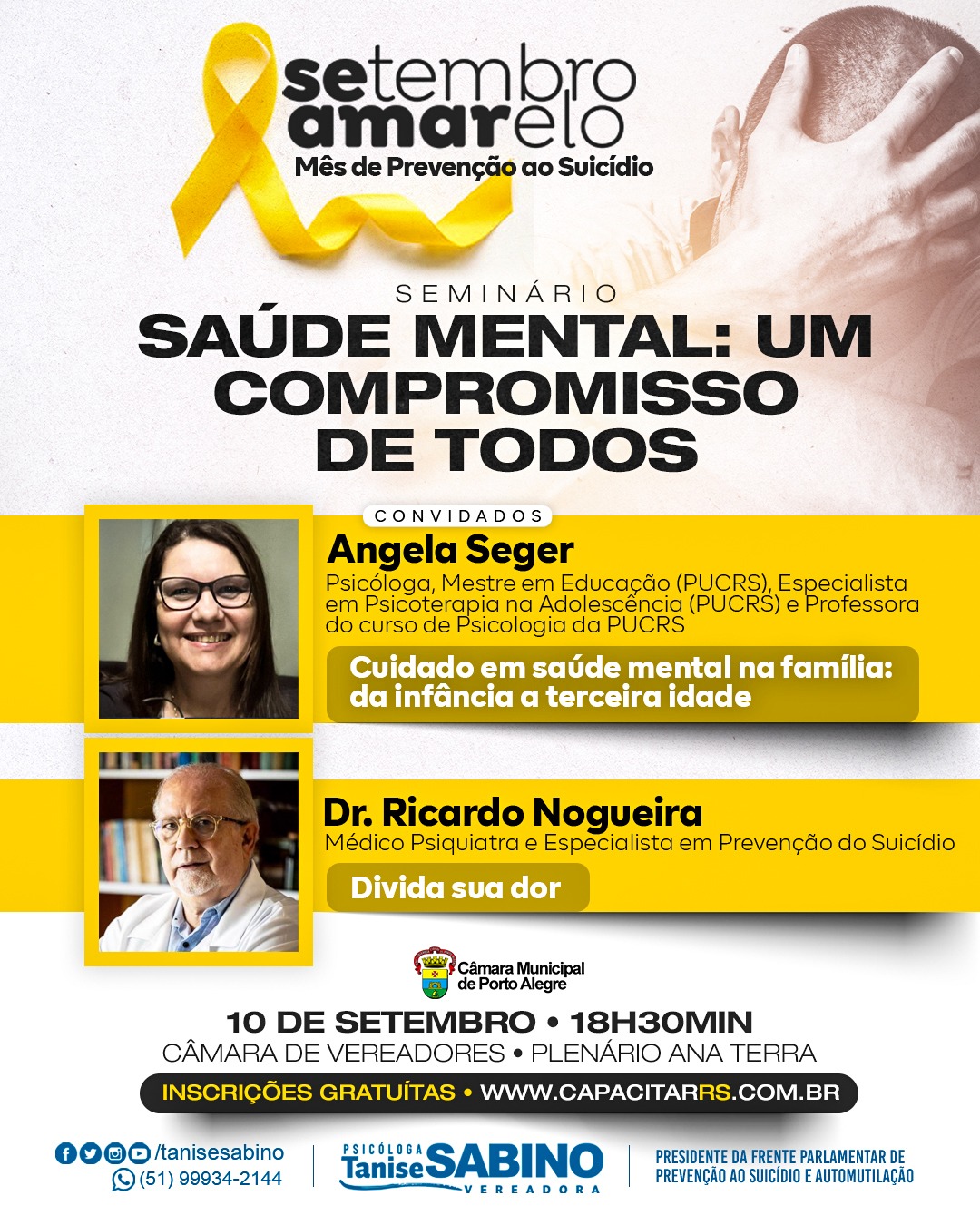 Dentro da programação do Setembro Amarelo, mês dedicado à prevenção ao suicídio, a vereadora psicóloga Tanise Sabino, presidente da Frente Parlamentar de Prevenção ao Suicídio e Automutilação, promoverá no dia 10 de setembro, às 18h30, no Plenário Ana Terra da Câmara Municipal de Porto Alegre, o seminário “Saúde Mental: um Compromisso de Todos”. O evento é gratuito e conta com inscrições abertas pelo site www.capacitarrs.com.br