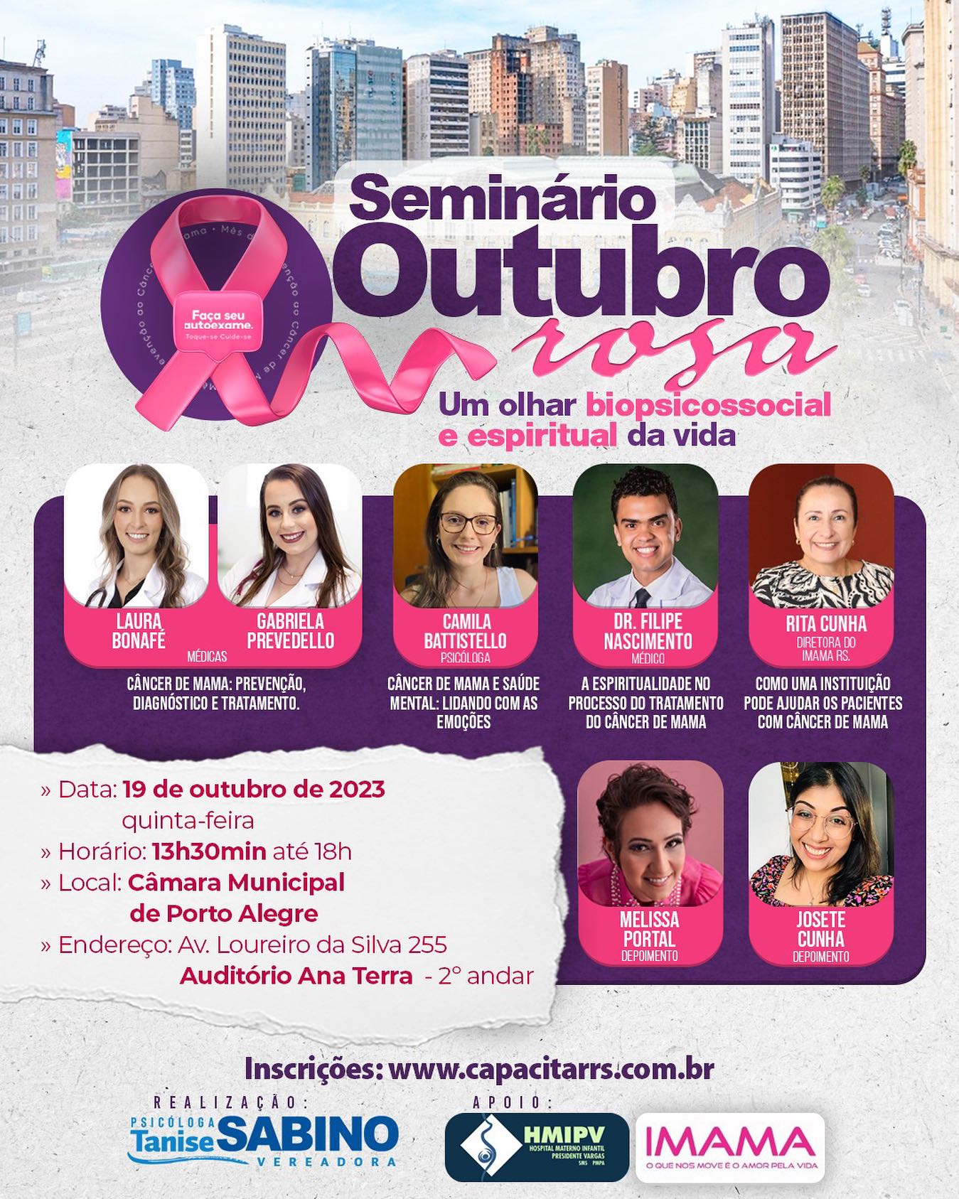 Outubro Rosa é o mês dedicado para promover a conscientização sobre a prevenção do câncer de mama. Neste sentido, a vereadora Psicóloga Tanise Sabino propôs o Seminário “Outubro Rosa: um olhar biopsicossocial e espiritual da vida”. O evento será realizado no próximo dia 19 de outubro, e trará várias falas para compor este olhar, como as dos médicos: Filipe Nascimento, Laura Bonafé e Gabriela Prevedello; da psicóloga Camila Batistello; da Diretora do IMAMA, Rita Cunha; e também o depoimento de duas mulheres que enfrentaram o câncer: Lemissa Portal e Josete Cunha.