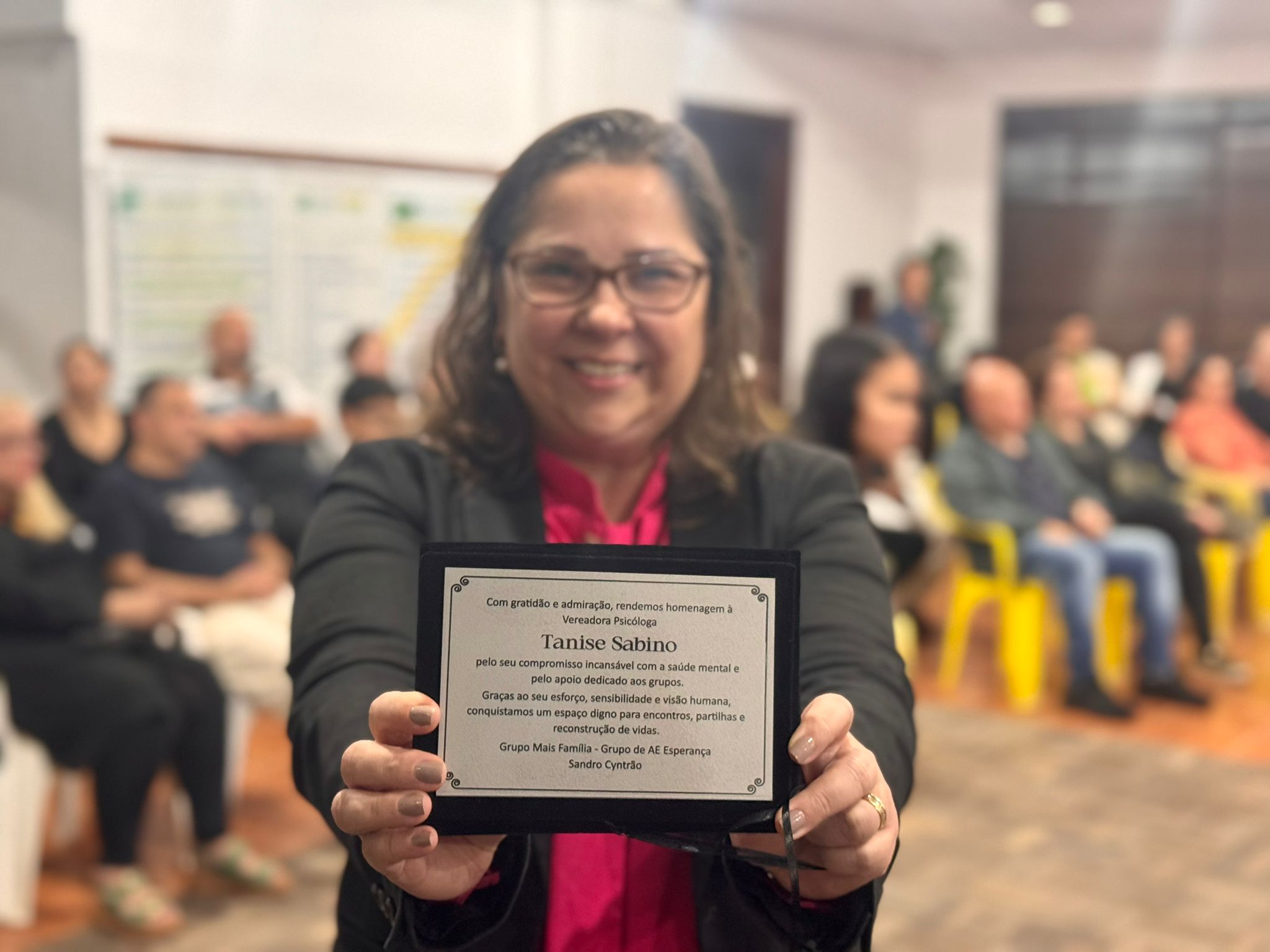 Na homenagem, a placa expressava: Com gratidão e admiração, rendemos homenagem à Vereadora Psicóloga Tanise Sabino pelo seu compromisso incansável com a saúde mental e pelo apoio dedicado aos grupos. Graças ao seu esforço, sensibilidade e visão humana, conquistamos um espaço digno para encontros, partilhas e reconstrução de vidas.”