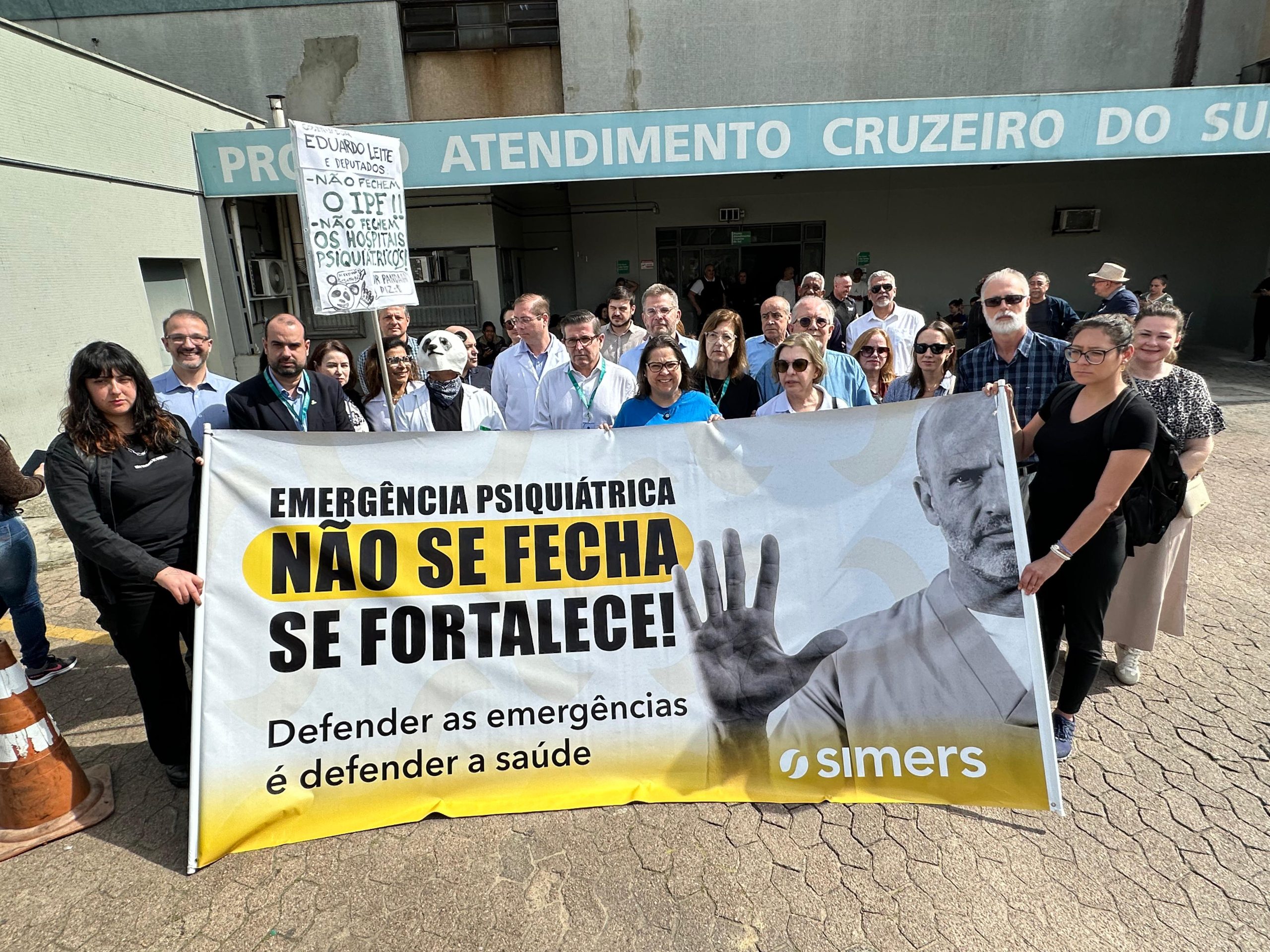 O protesto contou também com manifestações de lideranças do SIMERS e de profissionais da saúde mental que atuam diretamente nos plantões. Estava presente, Dr. Ricardo Nogueira, médico psiquiatra e referência em prevenção do suicídio.